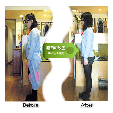 14歳、女性 母親談: 娘は常に姿勢が悪く猫背に悩んでいました。初めて先生の所へ治療に行った第一声が「猫背は治ります。何回か通院して頂いて施術の立ち方、歩き方を教えるのでそれを実践していったら必ず治りますよ」とおっしゃいました。それから通院しプライマリーウォーキングの立ち方歩き方を教えて頂き、娘も常に意識し頑張っていました。