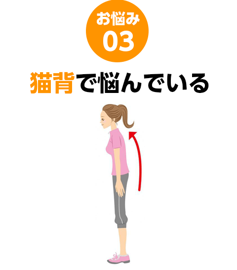 猫背はつま先体重で立っている人が、バランスをとろうとして背中を丸めてしまっているからです。また、内股になっている人も猫背になりますので、内股(O脚)をかかと体重に改善することによって猫背が伸びて姿勢が整ってきます。体重がかかとにシフトすることによって全体のバランスが整い、美しい姿勢が自然と保てるようになっていくのです。